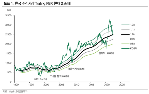 증권가에서는 주가순자산비율(PBR)을 근거로 코스피가 저점에 가까워졌다는 분석을 내놨다. PBR은 주가를 주당순자산가치(BPS)로 나눈 값이다. PBR이 1 미만이면 주가가 순자산가치보다 낮다는 걸 의미한다.