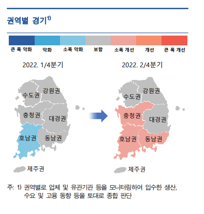 한은은 "수도권은 반도체가 파운드리 호조와 글로벌 데이터센터 업체들의 투자 확대로, 기계장비가 북미 지역과 신흥국 시장의 수요 확대로 증가할 것으로 예상된다. 서비스업 생산도 대면서비스업을 중심으로 회복세를 이어갈 것으로 예상된다"며 "다만 물가와 대출금리 상승, 물류차질 해소에 대한 불확실성 등의 영향으로 수도권은 보합, 나머지 대부분 권역에서도 소폭 증가에 그칠 것"이라고 말했다.