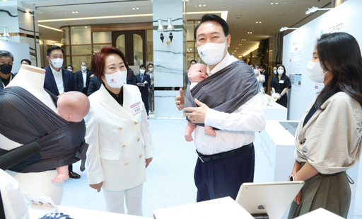 아기띠 제작 및 육아용품 업체 부스에선 정장 재킷을 벗고 "내가 한번 해봅시다"며 직접 아기띠를 착용하고 아기 인형도 넣어 안아보기도 했다. 이어 "이렇게 넣어요? 안 떨어져요? 아주 아이디어가 좋네요"라고 답했다.