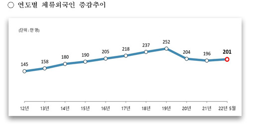 국내 체류 외국인은 2019년 말 당시 252만명까지 늘다 코로나 팬데믹으로 지난해 말엔 196만명이 채 되지 않았다.