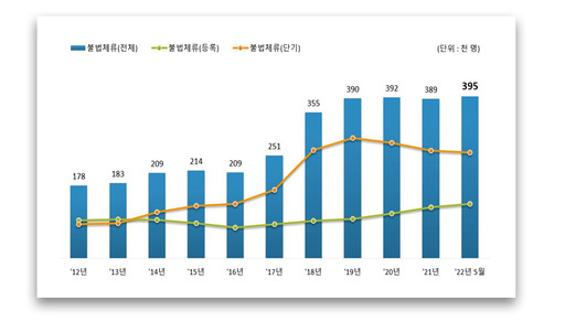 2017년 당시 25만명 수준이었던 불법 체류 외국인은 올해 5월 기준으로 39만4606명으로 40만명에 육박하고 있다. 불법 체류율도 이 기간 11.5%에서 19.6%까지 늘었다. 10명 중 2명이 불법체류 외국인이다.