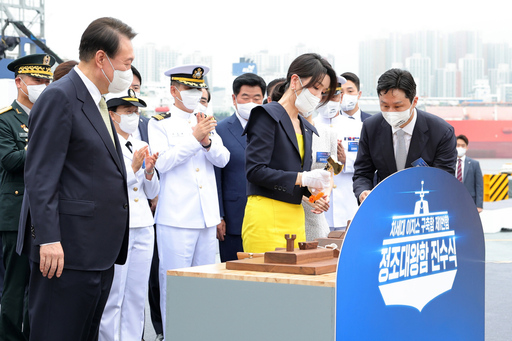 尹, 순수 국내 기술로 건조한 정조대왕함 진수식 주관…김 여사도 함께 참석