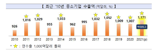 연도별 중소기업 수출액은 1032억(2017년)→1052억(2018년)→1009억(2019년)→1007억 달러(2020년) 등으로 매년 1000억 달러 이상을 기록했다.