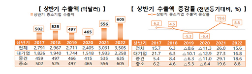 2017년부터 올해까지 상반기 기준으로도 중소기업 수출액은 502억→525억→497억→465억→556억→605억 달러로 등락을 거듭하면서도 2020년(465억 달러) 저점 이후 회복세다.