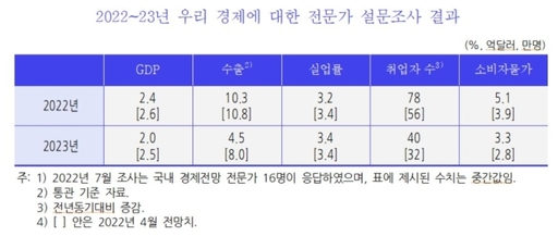 정규철 KDI 경제전망실장은 "현재 경기 상황은 지난번과 크게 달라지지 않았지만, 미래 전망은 조금 더 부정적으로 바뀌었다"며 "고물가가 계속되고 미국·중국의 경제가 안 좋아지고 있으며 금리 인상도 시차를 두고 경기에 반영될 것"이라고 전망했다.