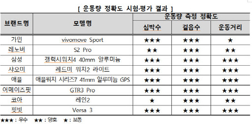 운동 거리 측정 정확도는 삼성·샤오미·애플·어메이즈핏·핏빗 등 5개 제품이 높았다. 걸음 수 정확도는 모든 제품이 우수했다.
