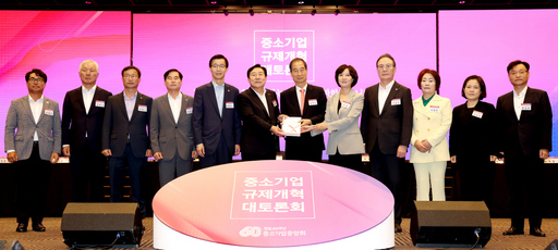 중소기업중앙회는 17일 오전 서울 여의도 중기중앙회에서 한덕수 총리, 이영 중소벤처기업부 장관, 방문규 국무조정실장 등 정부 관계자, 김기문 중기중앙회 등 중소기업계 대표를 포함해 140여 명이 참석한 가운데 '중소기업 규제개혁 대토론회'를 열었다.