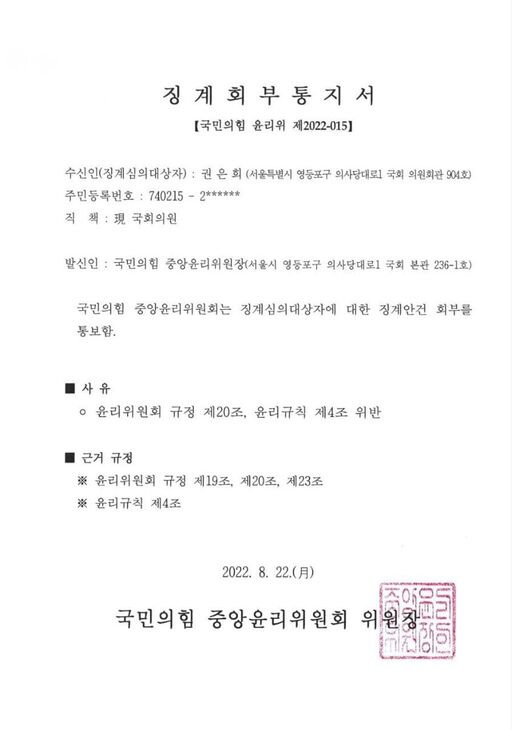 권 의원은 징계 절차에 대해 "(윤리위가) '윤리참칭위원회'가 돼 정당 정치를 희화화시키고 있다. 향후 징계절차에서 어떤 연유에서 경찰국 신설 찬성이 국민의힘 윤리 사항이 됐는지 확인하겠다"는 입장도 냈다.