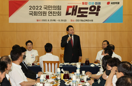 윤 대통령은 "어떻게 보면 더 진작에 이뤄져야 될 이 자리가 다소 늦은 감은 있지만, 가을 정기국회 앞두고 이런 자리를 만들기가 어렵다"며 "정기국회에서도 국민들께 국민의힘과 우리 정부가 정말 유능하고 국민들의 가려운 곳, 어려운 부분들을 제대로 긁어드리고 제대로 고쳐드릴 수 있는 유능한 정당과 정부라고 하는 것을 제대로 보여드리기 위해서 단합의 자리를 만들었다"고 말했다.