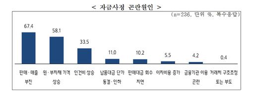 자금사정이 곤란한 원인(복수응답)으로는 ▲판매·매출부진(67.4%) ▲원·부자재 가격 상승(58.1%) ▲인건비 상승(33.5%) ▲납품대금 단가 동결·인하(11.0%) 순이었다.