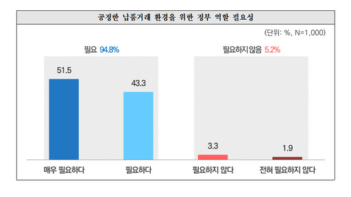 또 공정한 납품거래 환경을 조성하기 위해 정부의 역할이 '일정부분 필요하다'는 것에는 94.8%가 '그렇다'고 응답했다.