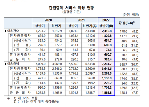 간편송금 서비스는 일평균 491만건, 6024억원으로 전기 대비 각각 6.9%, 14.3% 늘었다.