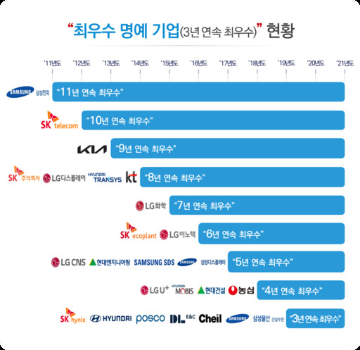 특히 삼성전자(11년), SK텔레콤(10년), 기아(9년), 현대트랜시스(8년), LG화학(7년), SK에코플랜트(6년) 등 24개사는 3년 연속으로 최우수 등급을 받아 '최우수 명예기업' 명단에 이름을 올렸다.