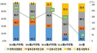 아울러, 코로나19 초기에는 사업체의 전체 조업중단이 많았지만 최근에는 근로시간 단축이 많아지는 경향을 보였다. 전체 조업중단 비율은 2020년 4월 41.8%에서 올해 6월 28.3%, 근로시간 단축은 같은 기간 43.7%에서 40.1%로 각각 감소했다.