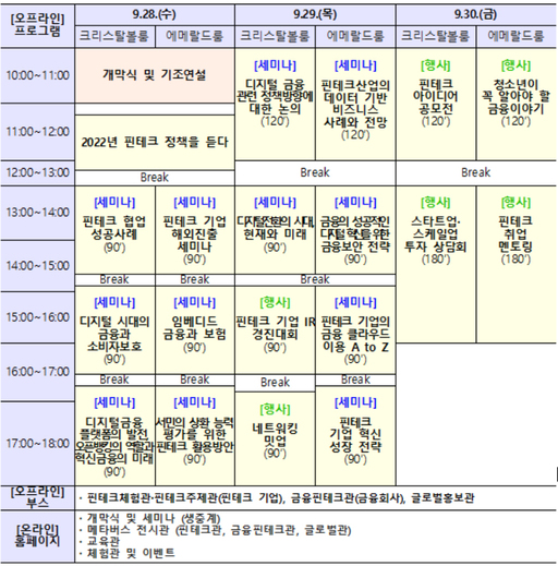한편 제4회 코리아핀테크위크 2022는 9월 28일부터 9월 30일까지 온·오프라인으로 개최된다. 오프라인 행사는 서울 소공동 롯데호텔에서 진행되며 핀테크 주제별 세미나·투자·채용·체험의 장을 제공한다. 온라인 행사는 코리아 핀테크 위크 2022홈페이지를 통해 시공간 제약 없이, 개막식·세미나·메타버스 전시관·교육관·체험관을 통해 핀테크를 체험할 수 있다.