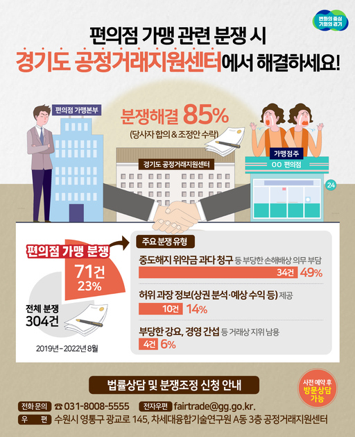 경기도가 2019년부터 3년 8개월간 편의점 관련 가맹사업거래 분쟁 71건을 접수한 결과, 41건을 조정 성립했다고 28일 밝혔다.