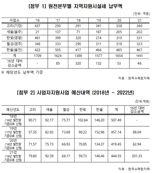 발전소주변지역 지원에 관한 법률 시행령에 따라 원자력본부가 원전으로부터 5km 이내에 속하는 읍·면·동을 지원하는 사업자지원사업비도 2018년(2016년 발전량 기준) 507억원에서 2021년(2019년 발전량 기준)444억 원으로 62억9400만원 감소했다.