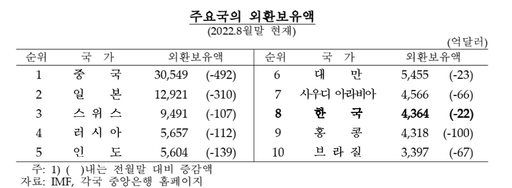 외환보유액은 유가증권이 3794억1000만달러로 91.0%를 차지했고 ▲예치금 141억9000만달러(3.4%) ▲SDR 141억5000만달러(3.4%) ▲금 47억9000만달러(1.2%) ▲IMF포지션 42억3000만달러(1.0%) 등이다. 지난 7월 말 기준 우리나라의 외환보유액 규모는 세계 8위 수준이다.