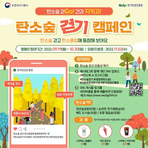 이번 캠페인은 10월 30일까지 진행되며, 온실가스 주요 흡수원으로 탄소중립에 기여하는 산림의 중요성을 국민에게 알리고 생활 속 탄소중립 실천 동참을 유도하기 위해 마련됐다.