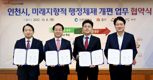 다음 지방선거에서는 영종국제도시 주민들이 영종구청장을 뽑을 수 있게 될 것으로 보인다. 인천광역시는 지난 6일 민선 8기 출범 100일을 맞아 시청 접견실에서 중구, 동구, 서구와 '미래지향적 행정체제 개편'을 위한 업무협약을 체결했다고 밝혔다.