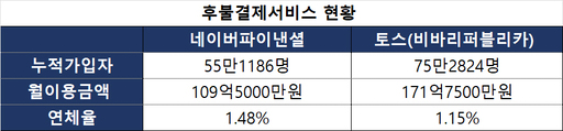 금융감독원에 따르면 네이버파이낸셜 후불결제서비스를 이용한 금액은 지난 8월 기준 109억5000만원으로 연체율은 1.48%로 집계됐다. 토스 후불결제 서비스를 이용한 금액은 같은 기간 171억7500만원으로 연체율은 1.15%이다. 올 상반기 카드사 연체율은 1.05%이다. 카드사보다 연체율이 최대 0.43%p 높다.