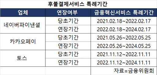 17일 금융권에 따르면 네이버파이낸셜, 카카오페이, 토스는 혁신금융서비스(금융규제 샌드박스)로 신청한 후불결제서비스를 올해 재연장 했다. 혁신금융서비스는 기존에 복잡하고 다양한 규제에 특례를 부여해 혁신금융서비스를 상용화해 볼 수 있는 제도다.
