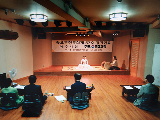 "경기민요 이수시험은 경기잡가 12곡을 다 외워서 심사위원들이 적벽가 어느 구절부터 해 보세요 하면 막힘없이 바로 노래가 나와야 해요. 한 곡당 한 시간이 넘는데 다 외워야 하는 것이지요. 그렇게 두 세 시간동안 심사위원이 지목하는 12곡을 완벽하게 불러야하고 엄격한 심사를 통과해야 비로소 이수자가 되는 거지요."