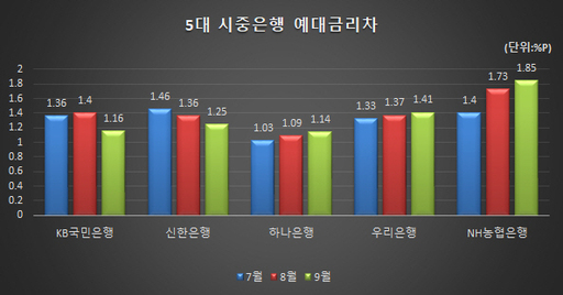 5대 시중은행 중 예대금리차가 가장 큰 곳은 NH농협은행이었다. NH농협은행의 9월 예대금리차는 1.85%p으로 전달(1.75%p)보다 0.12%p 늘었다. 하나은행과 우리은행의 9월 예대금리차는 각각 1.14%p, 1.41%p로 전달 대비 0.05%p, 0.04%p 증가했다. KB국민은행(1.16%p)과 신한은행(1.25%p) 의 예대금리차는 전달대비 0.24%p, 0.11%p 감소했다.