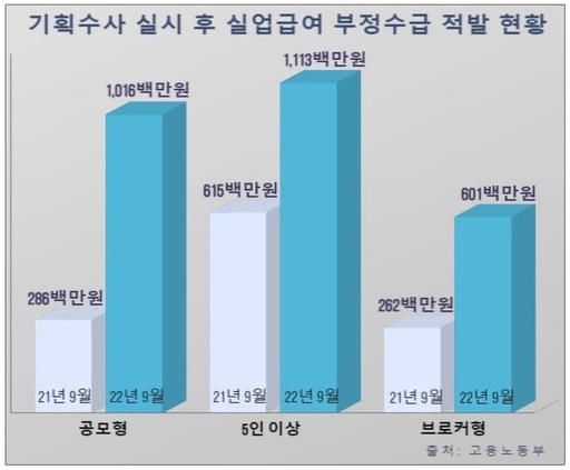 고용부에 따르면 올해 4월부터 검찰과 경찰은 합동으로 사업주 공모형, 브로커 개입형 등 실업급여 부정수급 기획조사를 벌였다.