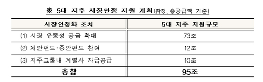 이에 따라 금융지주는 올해 연말까지 95조원 규모의 유동성을 공급한다. ▲시장유동성 공급 73조원 ▲채안펀드·증안펀드 12조원 ▲그룹내 계열사 자금공급 10조원을 지원한다.