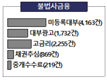17일 금융감독원에 따르면 지난해 불법사금융 피해신고센터에 접수된 신고·상담은 14만3907건으로 전년(12만8538건) 대비 12% 증가했다. 그 중 불법사금융은 9238건으로 전체 신고·상담건수의 25.7%를 차지했다. 세부적으로 살펴보면 미등록대부업체 신고 건이 4163건으로 가장 많았고, 고금리(2255건), 대부광고(1732건), 채권추심(869건)이 뒤를 이었다.