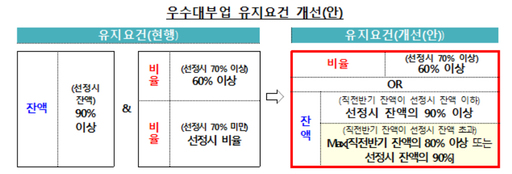 앞으로는 잔액요건(저신용대출 100억원 이상)으로 선정된 경우 저신용대출 잔액이 100억원 미만이라면 선정시 잔액의 90%를 유지해야 하고, 저신용잔액이 100억원 이상이라면 심사시 잔액의 80%이상 또는 선정시 잔액의 90%를 유지하면 된다. 유지심사시 저신용대출잔액이 100억원이 넘더라도, 선정 당시 잔액의 90%를 유지할 수 없는 경우가 발생할 수 있어서다. 잔액기준 대출규모가 증가한 경우 유지요건의 기준금액도 늘린다