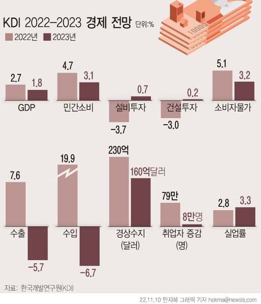 경제 위기는 각종 지표에서 확인할 수 있다. 올해 경제 성장률은 한국개발연구원(KDI)에서 최근 2.7%로 소폭 낮춰 발표했다. KDI는 지난 10일 발표한 2022년 하반기 경제전망에서 소비자물가 상승률을 상반기(2.2%)보다 1.0%포인트 올린 3.2%로 조정했다. [관련기사 4면]