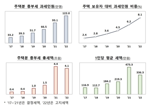 올해 주택·토지분 종합부동산세(종부세)는 130만7000명이 약 7조5000억원 가량 납부하게 될 전망이다. 이 가운데 주택분 고지 인원은 122만명으로 5년 전보다 4배가량 늘었다. 올해 집값이 하락했지만 과세액은 올해 초 오른 공시가격을 토대로 매겨져 올해 종부세 고지서를 받아든 납세자들의 조세 저항이 클 것으로 보인다.