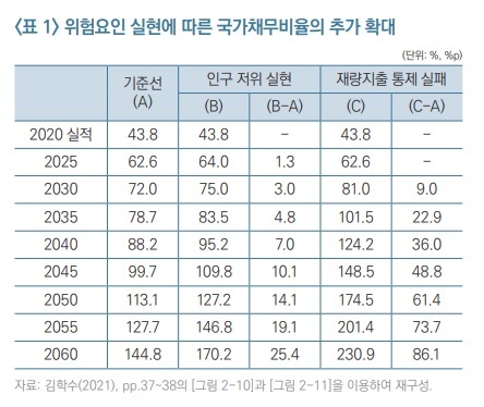 김학수 KDI 선임연구위원은 "코로나19 위기 대응 과정에서 재정여건이 크게 악화되고, 인구 고령화에 따른 복지재정 수요 증가로 장기 재정여건이 크게 악화될 것"이라며 "현행의 법, 제도, 관행들은 유지된 상태에서 인구구조의 변화와 거시경제변수들에 의해 산출된 2060년 국가채무비율은 144.8% 수준"이라고 설명했다.