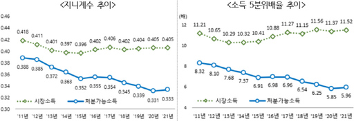 균등화 처분가능소득의 5분위 배율도 5.96배로 전년대비 0.11배포인트(p) 올랐다. 균등화 처분가능소득 5분위 배율은 처분가능소득을 가구원 수로 나눈 뒤 상위 20%의 소득이 하위 20%의 몇배인지를 보는 지표다. 배율이 커진다는 것은 빈부격차, 즉 분배의 악화를 의미한다.