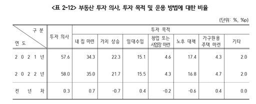그러나 향후 소득이 증가하거나 여유자금이 생기면 부동산에 투자할 의사가 있는 가구수는 전년대비 0.3%p 증가한 58%로 나타났다. 투자 목적은 내 집 마련이 35%로 가장 많았고, 가치상승 21.7%, 노후대책 16.8%였다.