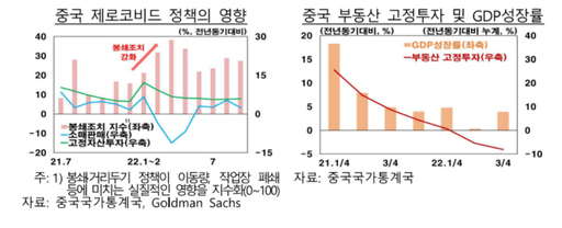 골드만삭스(Goldman Sachs)에 따르면 현 수준의 제로코비드 정책이 1년간 지속될 경우 중국의 성장률은 4~5%p 추가하락 한다. 또 부동산 부분(부동산 서비스업, 건설 등)이 10% 위축시 전·후방 산업 생산 감소 등으로 전체 GDP가 2.2~2.9% 떨어진다. 세계경제 분절화가 그동안 성장을 견인해온 수출을 제약하고, 정책여력이 약화되면 경제 성장 모멘텀 회복이 쉽지 않을 수 있다는 설명이다.