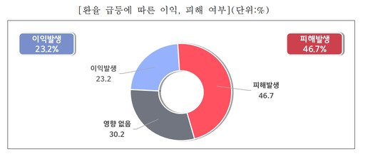 아울러 최근의 원·달러 환율 급등 영향으로 응답기업의 46.7%가 피해를 겪고 있는 것으로 확인됐다. '별 영향이 없다'는 기업은 30.2%, '이익이 발생했다'는 기업은 23.2%였다.