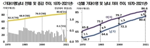 통계청이 6일 발표한 '2021년 생명표'를 보면 지난해 출생아 기대수명은 83.6년으로 전년보다 0.1년 증가했다. 생명표는 특정 나이의 사람이 몇 년을 더 살 수 있는지 보여주는 표다.