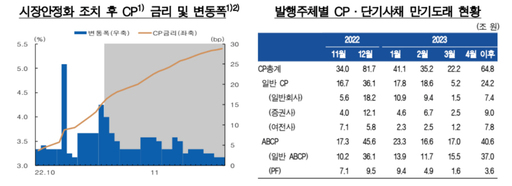 한은은 부동산 경기둔화가 지속되면서 PF-ABCP, 건설사 발행 회사채 등에 대한 높은 경계감은 유지될 것으로 전망했다. 연말까지 대규모의 기업어음(CP) 만기도래가 예정 되어있는 만큼 금융기관의 연말 북클로징 영향으로 자급수급의 불확실성이 높아질 경우 차환 또는 상환에 차질을 빚을 가능성이 크다.