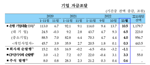 대기업 대출은 운전자금 수요가 늘고 회사채 시장이 위축되며 6조5000억원 늘었다.
