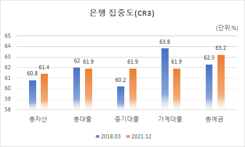 우선 일반은행을 대상으로 시장집중도를 분석한 결과 중기대출과 총예금 부문을 제외하고는 은행의 집중도는 낮아진 것으로 집계됐다. 중기대출은 2018년 CR3 60.2%에서 2021년 61.9%로, 총예금은 같은 기간 62.5%에서 63.2%로 올랐다. 반면 총대출은 2018년 62%에서 61.9%, 가계대출은 63.8%에서 61.9%로 떨어졌다. CR3은 100%에 가까울수록 독점도가 높아 독과점 시장을 의미하고, 낮아질수록 경쟁시장을 의미한다.
