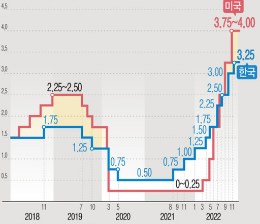 미국 Fed가 금리를 0.5%p 인상해 기준금리 상단이 연 4.5%가 될 경우 한국은행의 기준금리 3.25%와의 격차는 1.25%p로 벌어진다. 한국은행이 설정한 한미 금리차 마지노선 1%p를 넘어서는 수준이다.