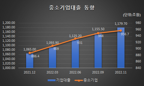한국은행의 '11월 금융시장 동향'을 보면 기업대출은 전달보다 10조5000억원 늘어난 119조7000억원으로, 통계속보치 작성을 시작한 2009년 6월 이후 최대폭으로 증가했다.