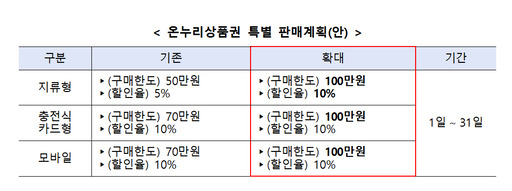 정부는 전통시장을 활성화하고 생활물가 부담을 낮추기 위해 온누리상품권도 이달 1일부터 특별 할인판매하고 있다. 지난 8월 새로 출시한 온누리상품권 충전식 카드형 상품권을 비롯한 모바일·지류 상품권 등 3종류 모두 12월 한 달 동안 10% 싸게 판매한다. 1인당 구매한도 역시 종별로 최대 100만원으로 올렸다.