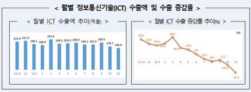 14일 산업통상자원부에 따르면, 11월 ICT 수출액은 166억6000만달러로 전년동월(214억9000만달러) 대비 22.5% 감소했다.