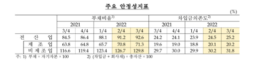 안정성도 악화한 모습이다. 기업들의 3분기 부채비율은 92.6%로 전분기(91.2%)에 비해 확대됐다. 이는 2016년 3분기(91.8%) 이후 약 6년 만의 최대치다. 차입금 의존도도 단기차입금 증가에 따라 24.5%에서 25.2%로 외부차입으로 인해 모두 상승했다.