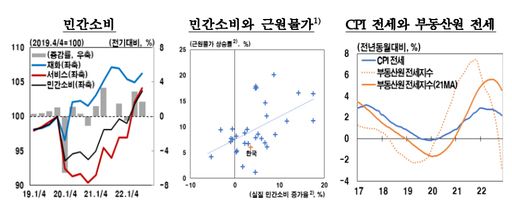 내년 근원물가 흐름을 살펴보면 민간소비는 고물가, 고금리로 실질 구매력이 감소하면서 소비심리가 악화될 전망이다. 코로나 팬데믹 시기 국가별로 비교한 결과 직전 민간소비의 증가폭과 근원물가 상승폭은 비슷한 흐름으로 이어졌다. 민간소비의 증가폭이 약화될 경우 근원물가도 상승폭이 축소될 수 있다는 분석이다.