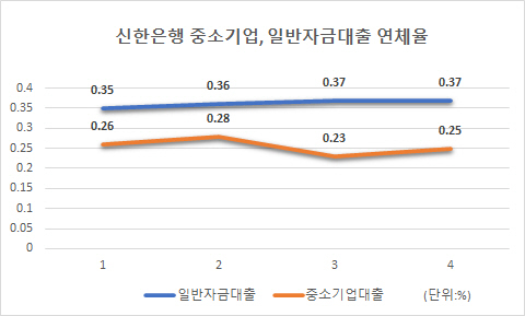 연체율은 가계대출의 경우 주택담보대출 0.09%, 일반자금대출 0.37%로 전분기와 비슷한 수준을 유지하고 있다. 반면 총 중소기업대출은 전분기 0.23%에서 0.25%로 올랐다. 비외감 중소기업이 0.39%에서 0.42%로 늘고, 소호가 0.14%에서 0.16%로 증가한 영향이다.